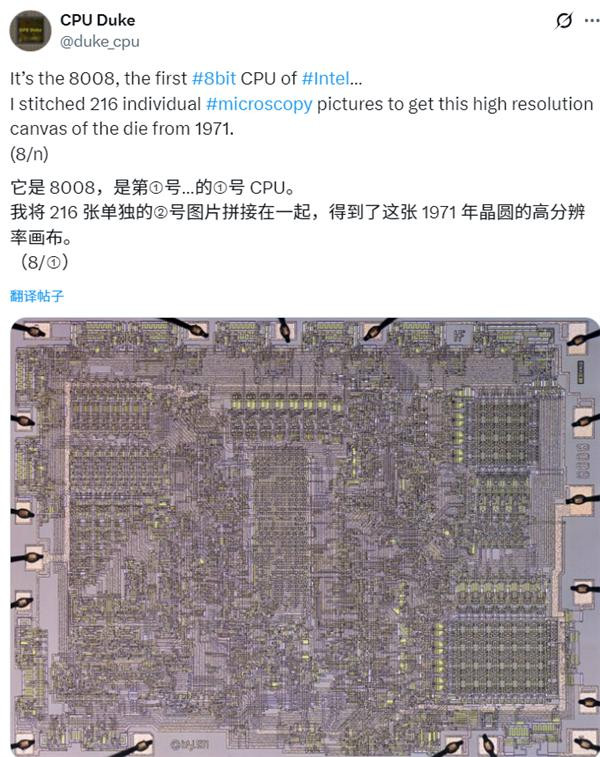 快科技10月22日消息,近日,一位名为CPU Duke的CPU收藏家,以一种专属的浪漫方式,分享了Intel 8008处理器史上最清晰、细节最丰富的芯片特写(Die-shot)图像。